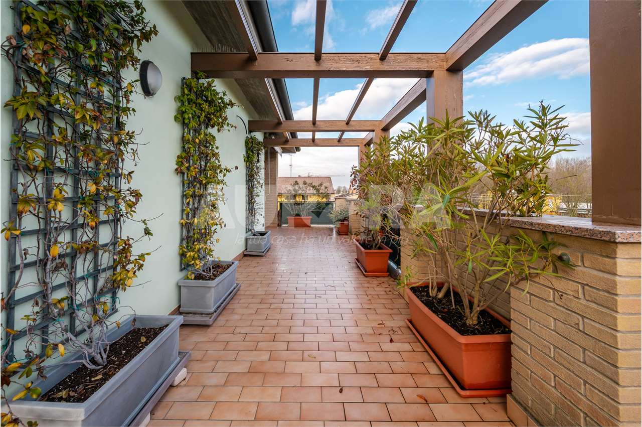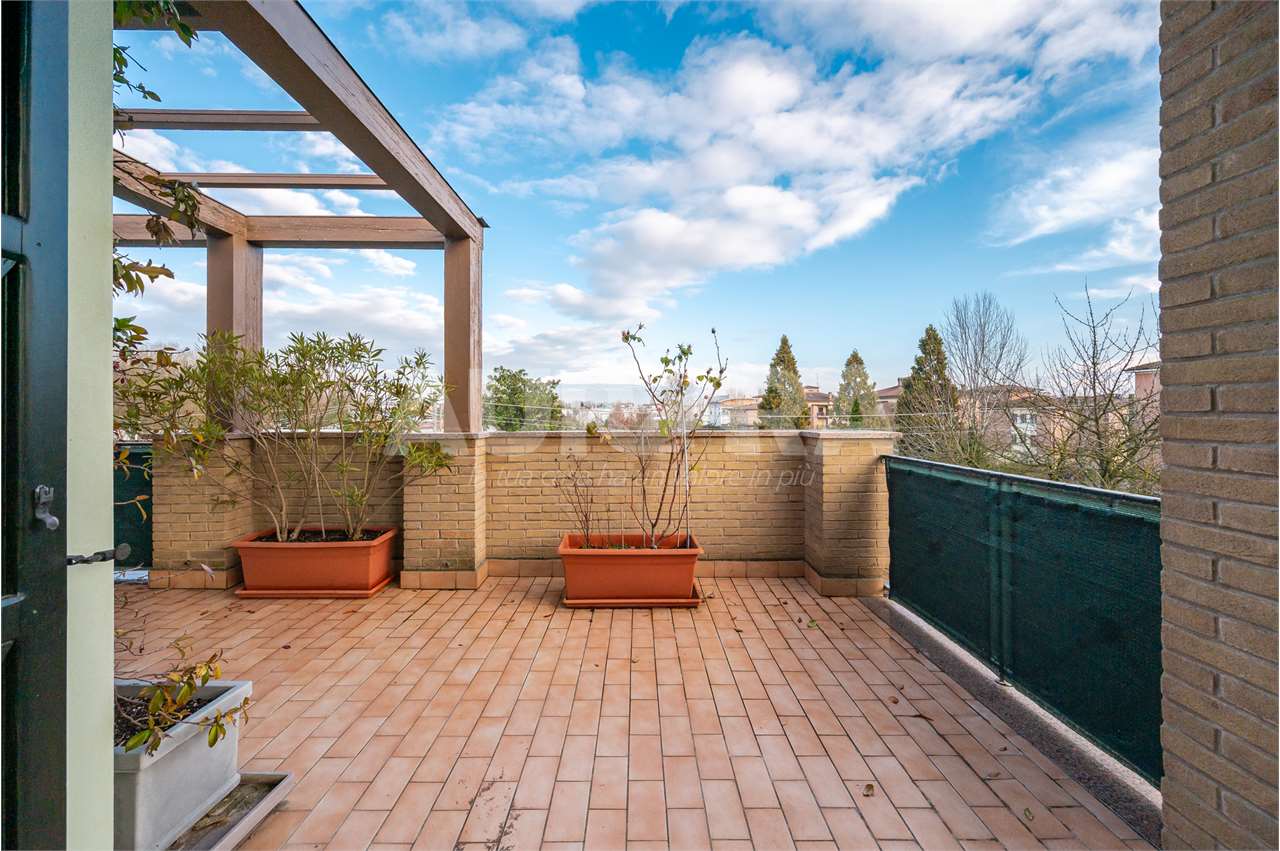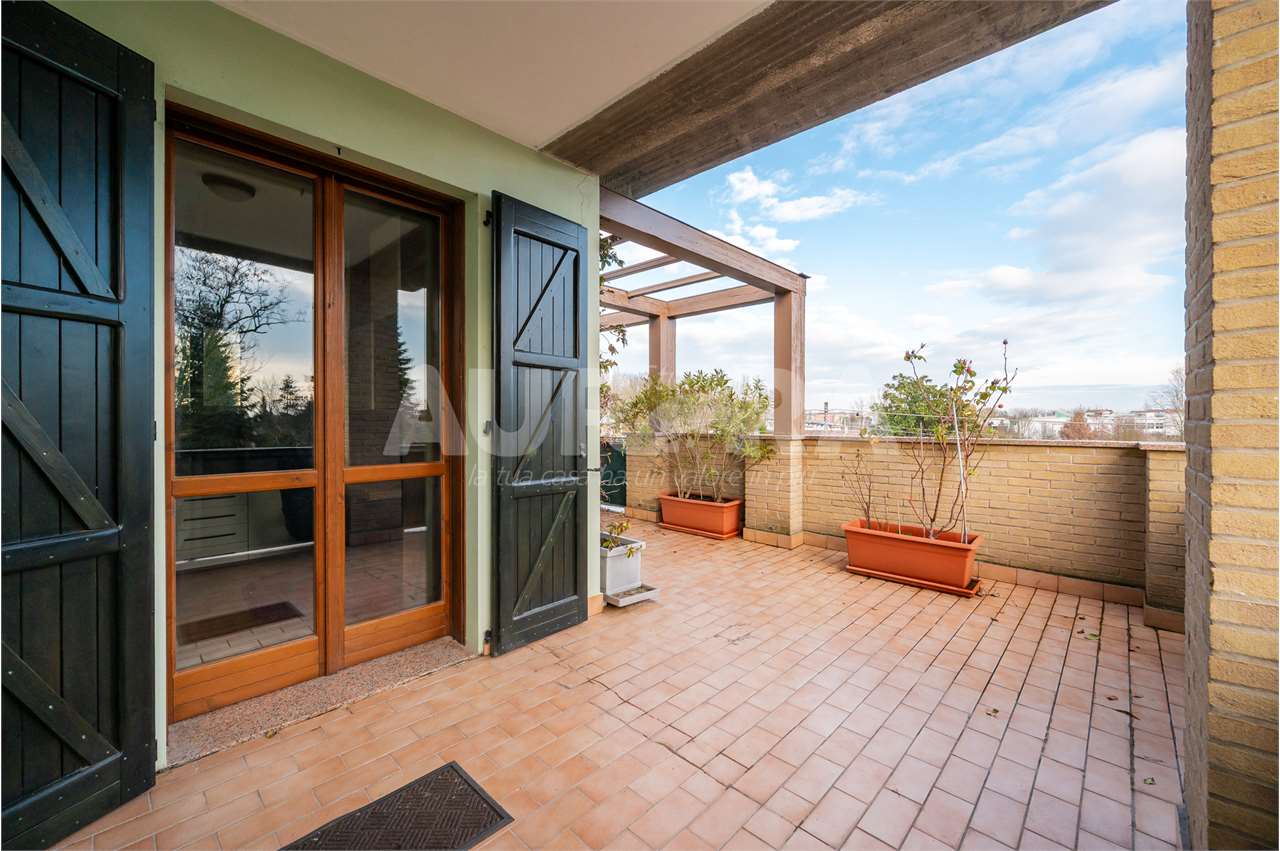 All’esterno trovi tre balconi e un terrazzo enorme, vero punto forte della casa. Garage al piano terra.